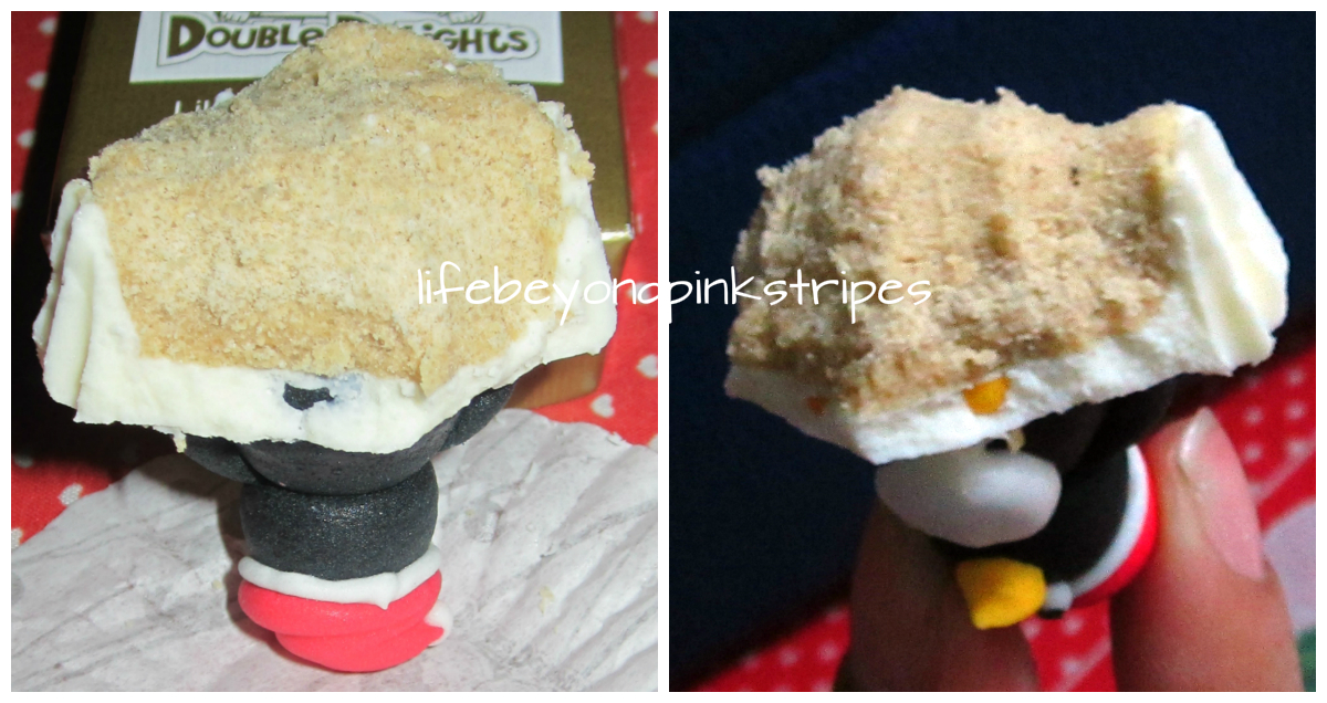 Now, let's dissect this cutie patootie dessert.:) Its main part is polvoron, a common Filipino dessert created out of toasted flour, powdered milk, butter and sugar mixed together and then molded into various shapes, round and oval being the most common. Double Delights made it possible for the polvoron to take the shape of a cupcake. White chocolate covers the upper half of the polvoron and a penguin sugar topper completes the sweet delight.